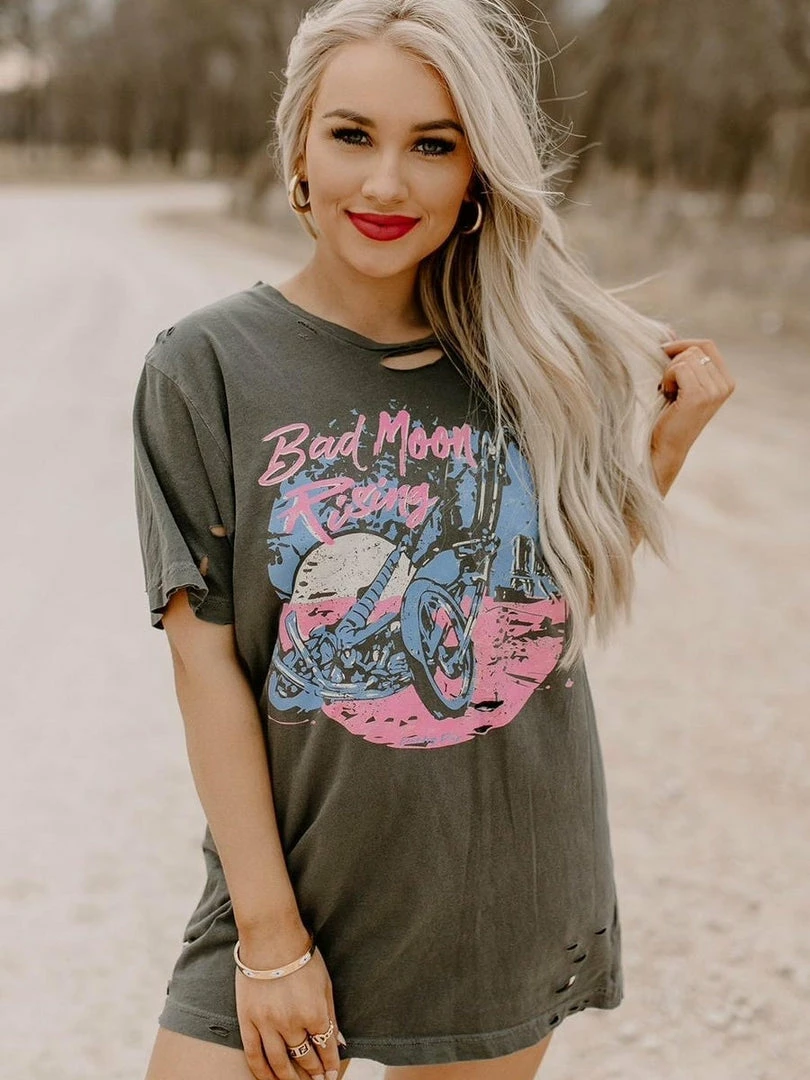 Calling all bad chics! This is the tee! This faded black tee features a a chopper and the bright pink just makes this tee stand out! Perfect for a day riding motorcycles!Â