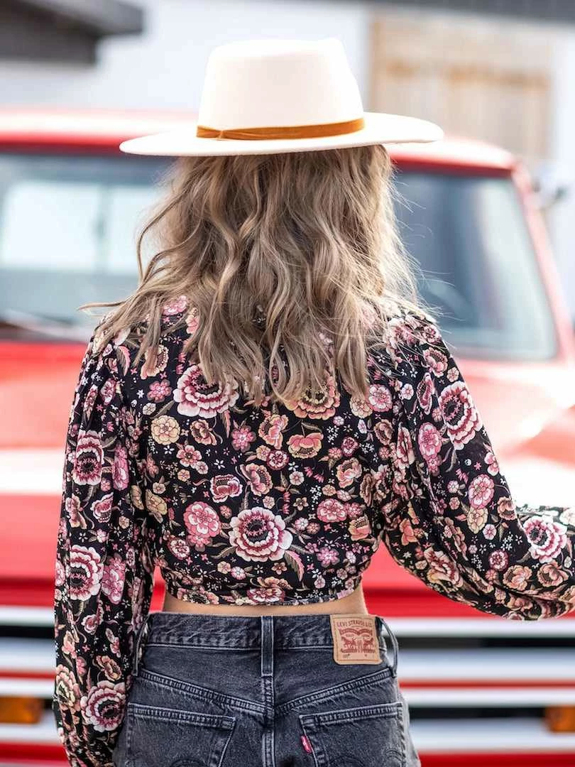 Talk about versatility! The “Got You Wrapped” top is going to be the hottest thing this spring and summer! This crop top features a black floral print with pops of pink. It is very flowy and will keep you cool all day and night! If you don’t want to tie it up, you can wear it untied and add a tank under it. The balloon sleeves are so comfortable! Great for all day wear! This top pairs perfectly with your high-waisted denim pants and your favorite denim shorts! Toss on your western cowgirl boots for a southern style or pair with wedges to dress it up!Â