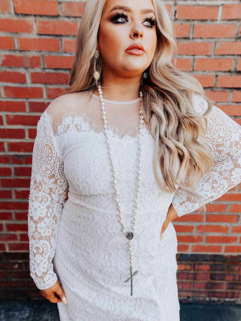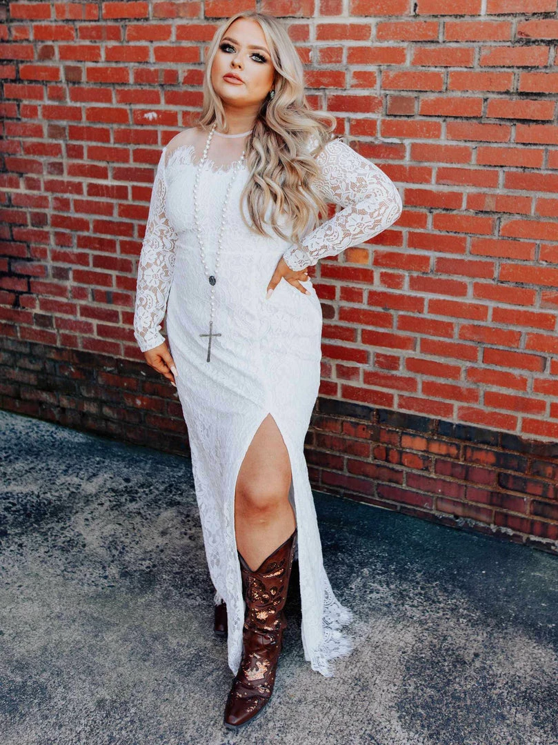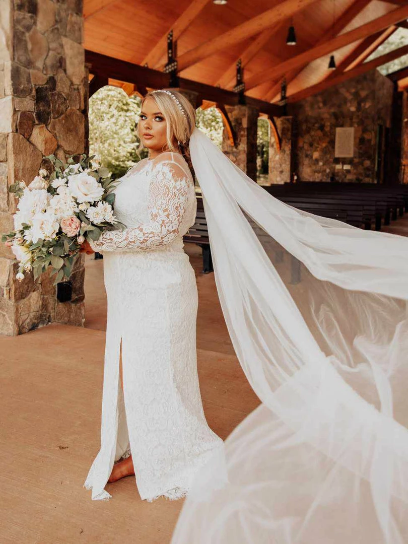 Look simply breathtaking as your spin around the dance floor in the Tonight We Dance full length, long sleeve bridal gown. Featuring a sheer fabric with floral patterns throughout, a high split, and a zipper back. Complete the look by pairing it with a Rhinestone Belt.Â