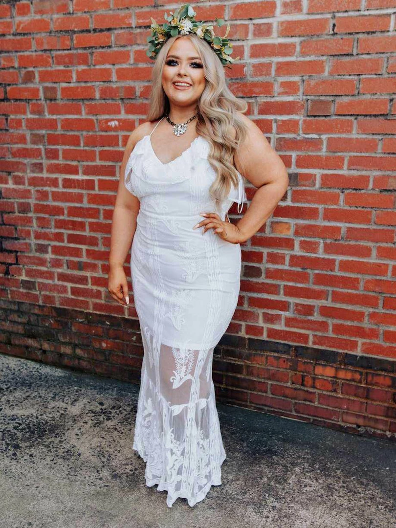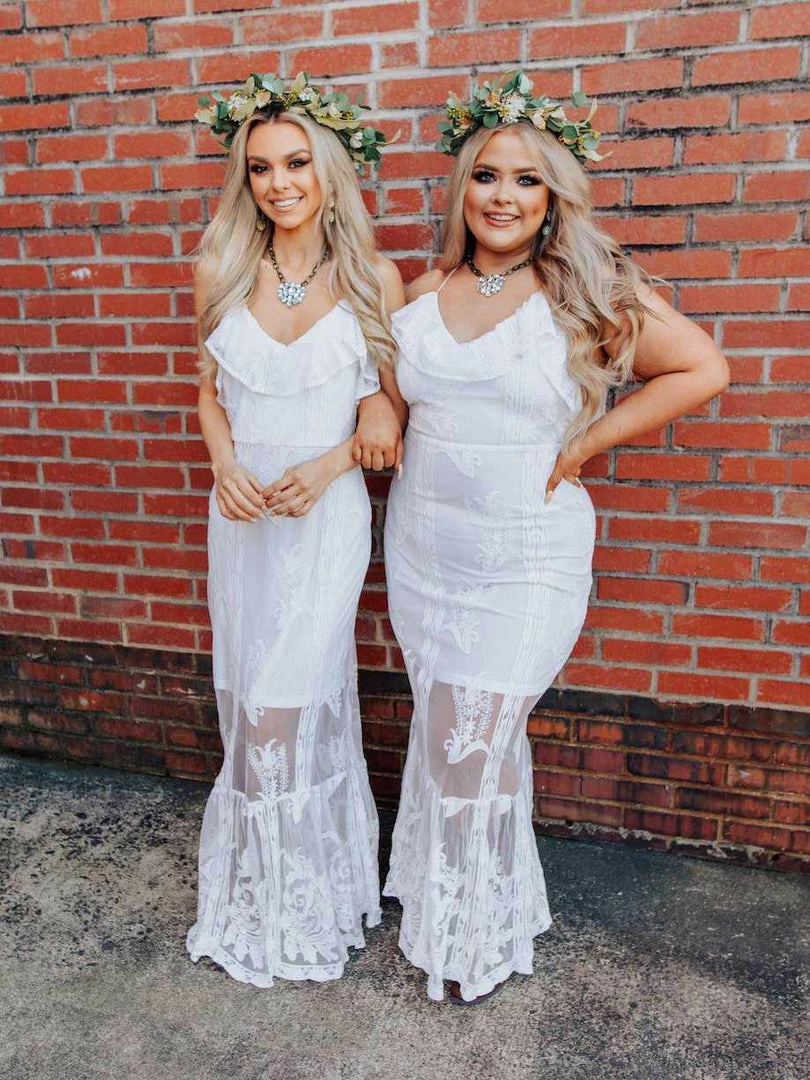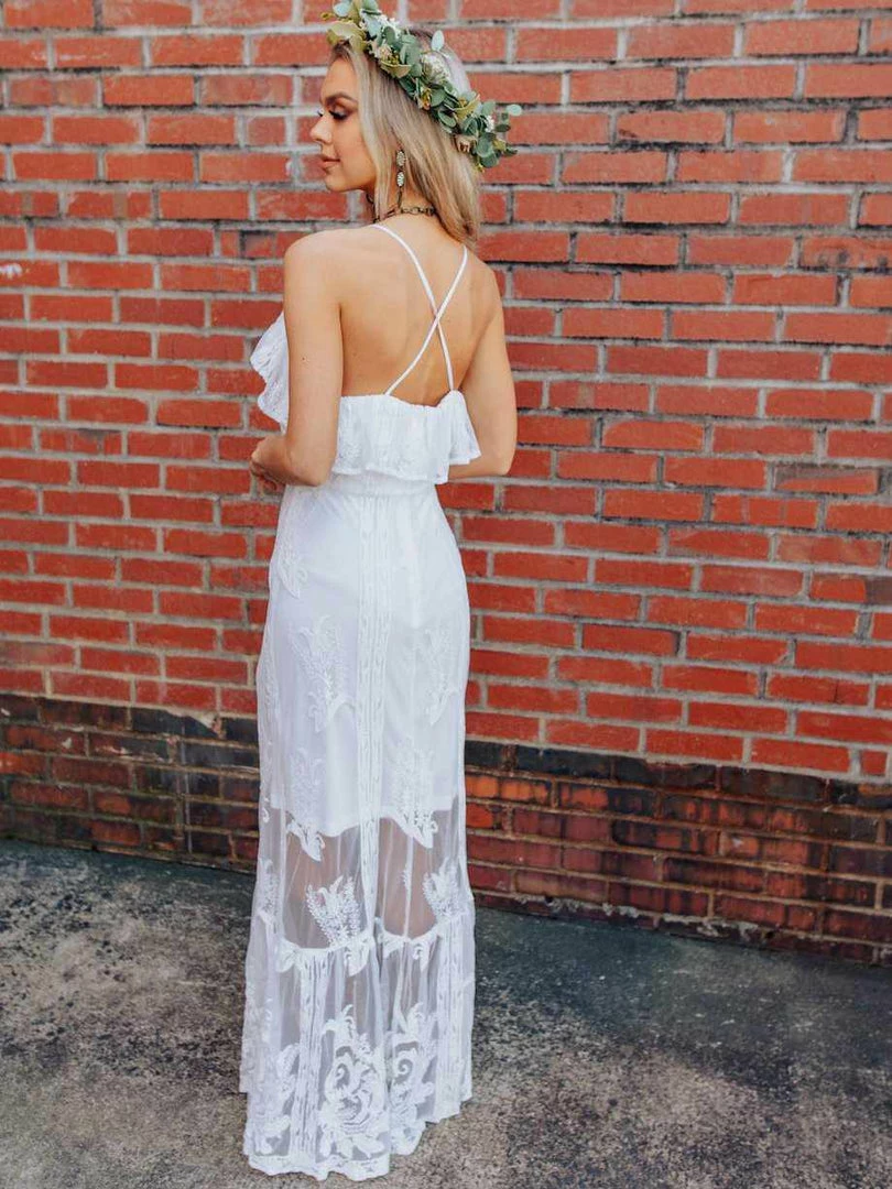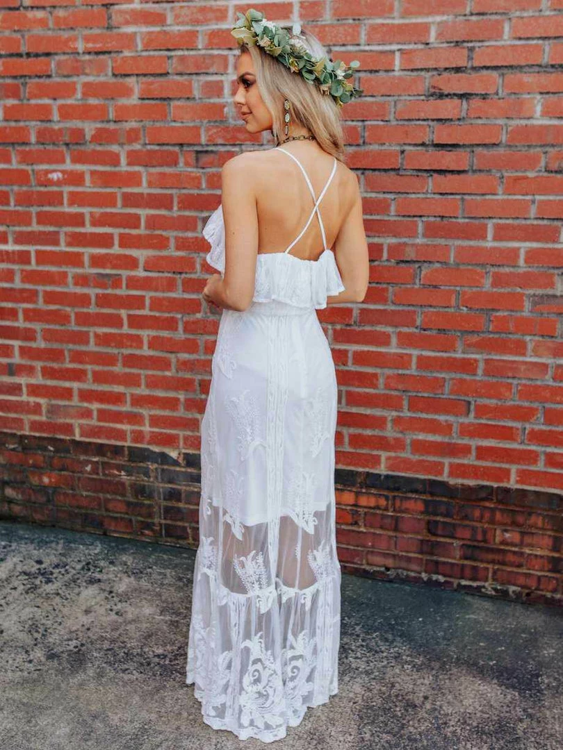 Simple and sexy, the Dressed in White dress features a beautiful tulle overlay with ornate floral patterns, a ruffled top, and adjustable cross-back spaghetti straps for the perfect fit.Â