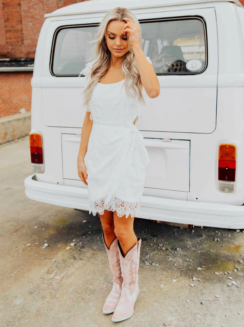You better get used to hearing, “Oh, Hello Beautiful!” because you are going to look fabulous in this little number from the Chics. Sexy yet simple with its lace applique straps and scoop neck, the Hello Beautiful dress features a peek-a-boo waist that shows just a tad bit of skin on the side, while the wrap skirt with an illusion split accentuates your legs for gorgeous warm weather look.Â