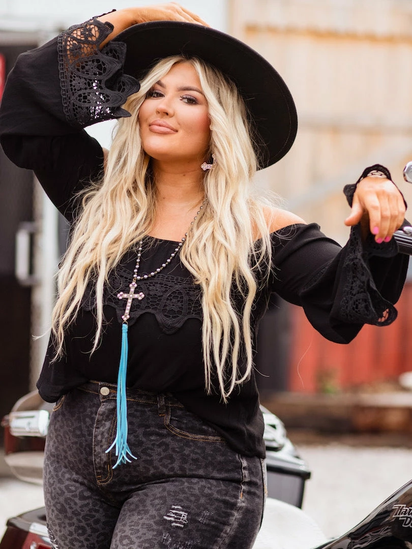 Lace give ’em something to talk about this season! We are lovin’ this off the shoulder cutie! Our “Lace Talk About It” Top is a true SHOWSTOPPER! Lace crochet detail, flirty & fun vibes perfect for the Spring & Summer season! True to size, lined, easily styled with your favorite denims! Available in multiple colors. Pair these with your favorite western cowgirl boots!