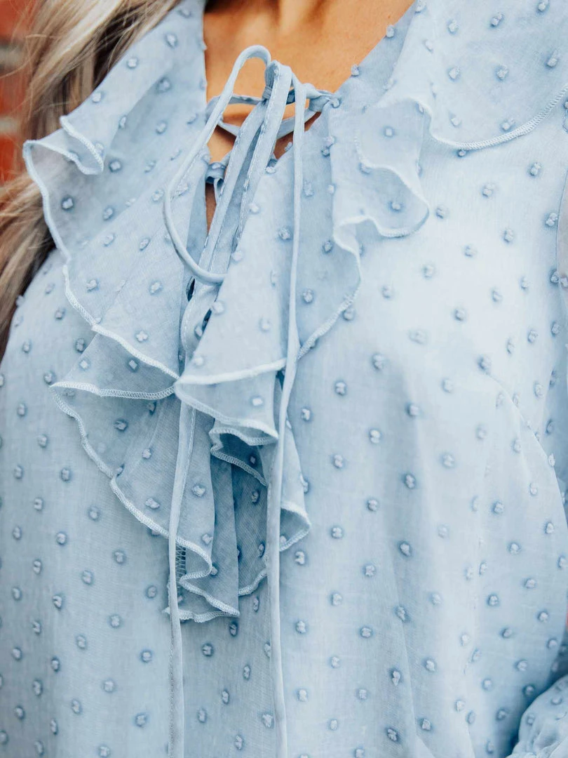 A long-sleeve cold-shoulder style ruffled top with a swiss dot pattern. Pair it with jeans and sandals or boots. Multiple colors available.