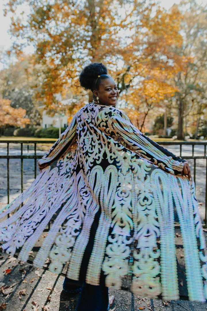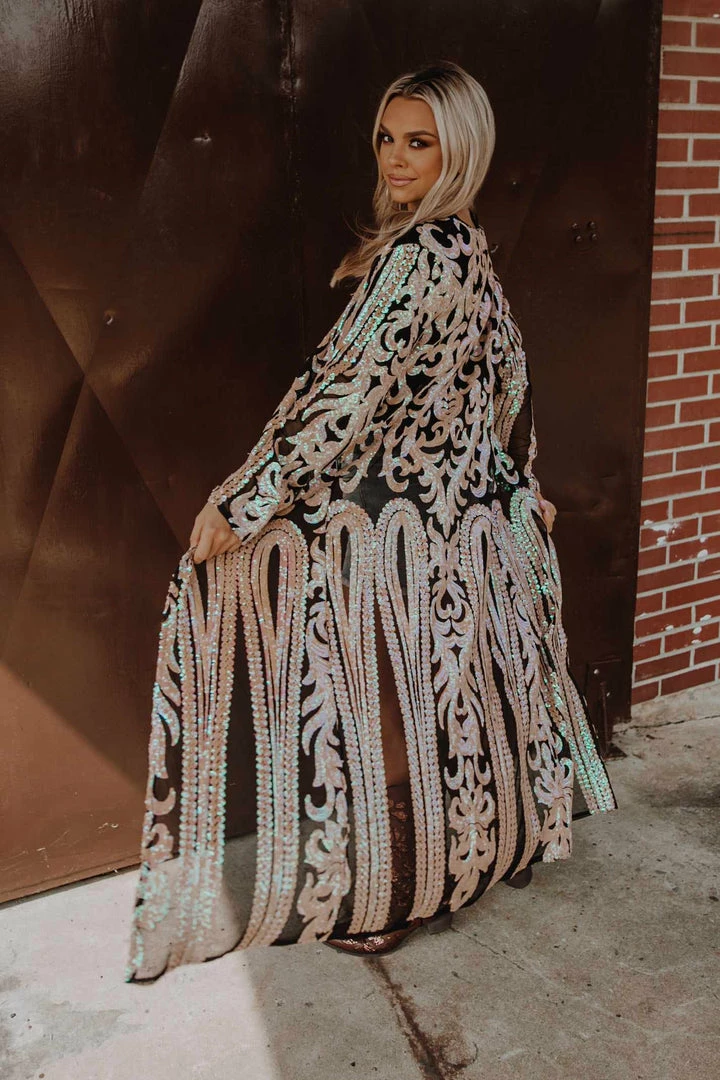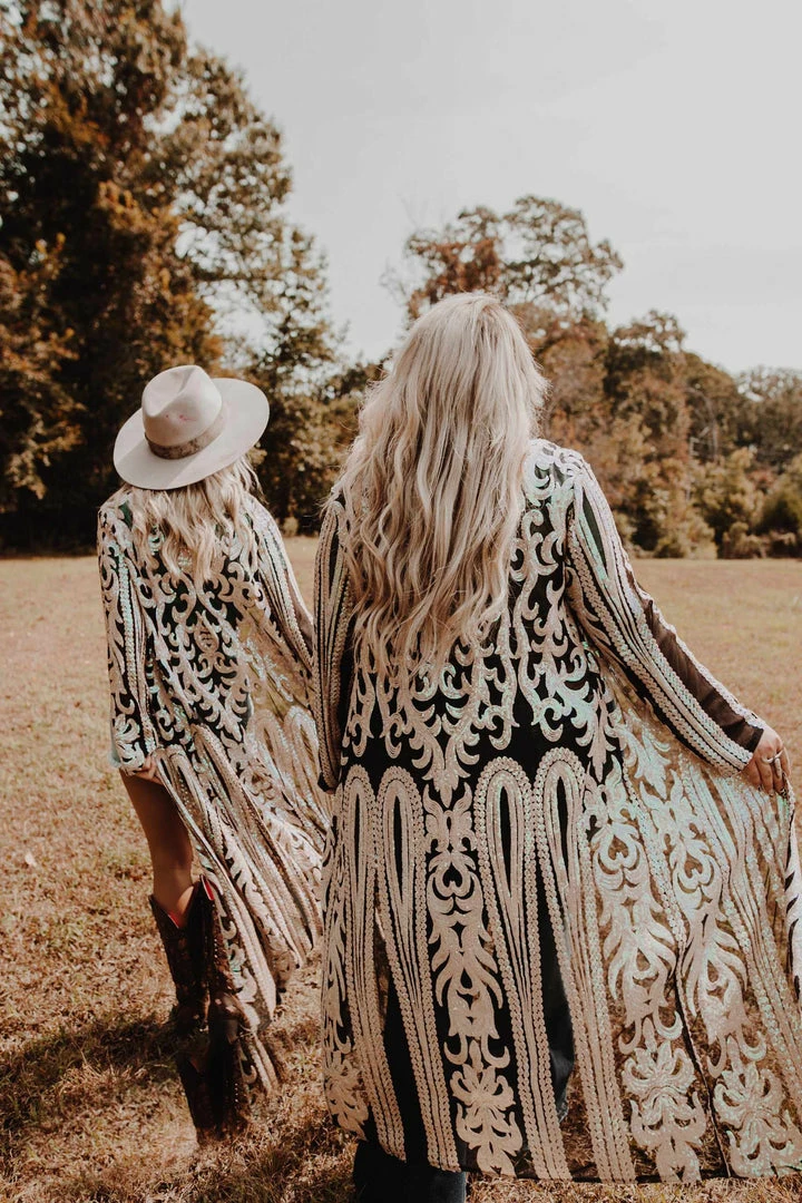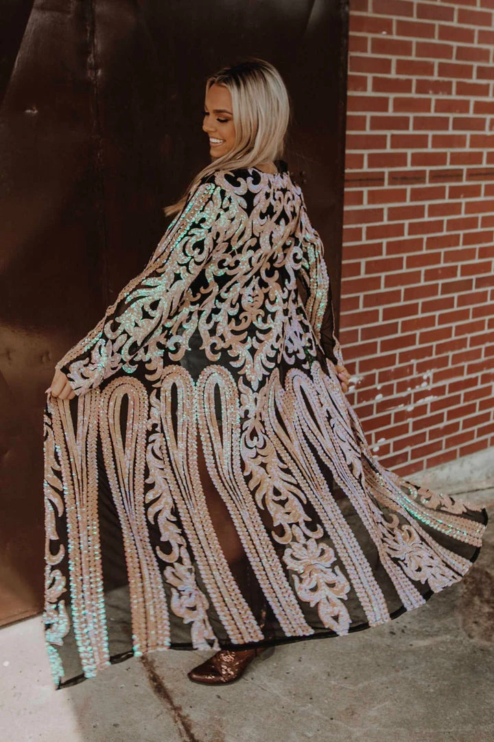 This handmade long kimono sequin duster is absolutely AMAZING! Great for special occasions, dates, or concerts. Even special for holidays like Christmas and the 4th of July. With its lightweight flattering fit, it is sure to have you sparkle and shine anywhere you go! This piece is a LIMITED EDITION! Pair a duster with your favorite tops, bottoms or dresses for a sassy look!