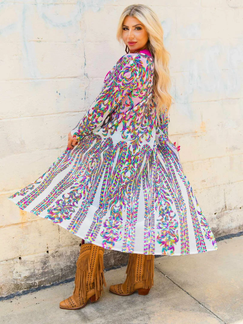 This duster is beautiful, but I wish it came in more sizes. The rainbow sequins are stunning, but the fit was a bit off for me.