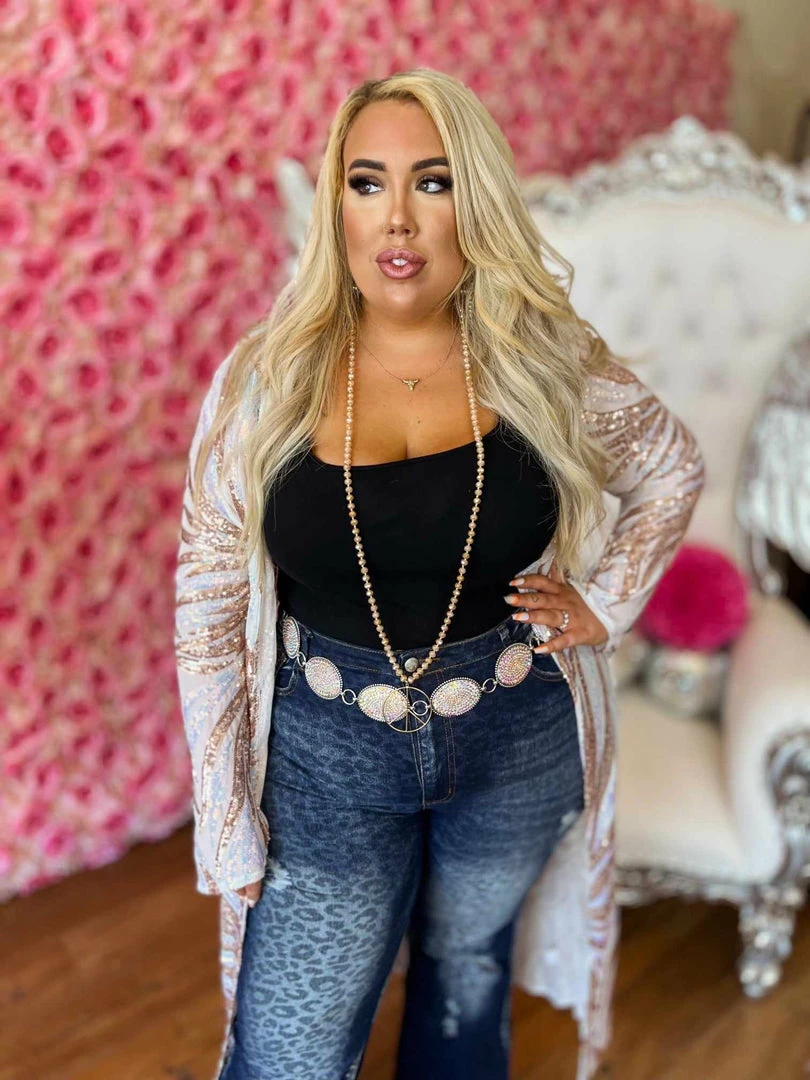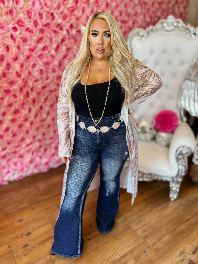 This handmade long kimono sequin duster is absolutely AMAZING! Great for special occasions, dates, or concerts. Even special for holidays like Christmas and the 4th of July. With its lightweight flattering fit, it is sure to have you sparkle and shine anywhere you go! This piece is a LIMITED EDITION! Pair a duster with your favorite tops, bottoms or dresses for a sassy look!