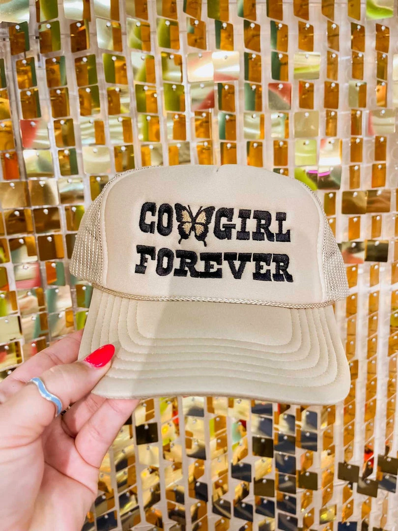 Trucker hats are so fun! Cowgirl Forever Hat. It’s great for those dreadful bad hair days or days you just don’t feel like doing your hair! Tan Trucker Hat.