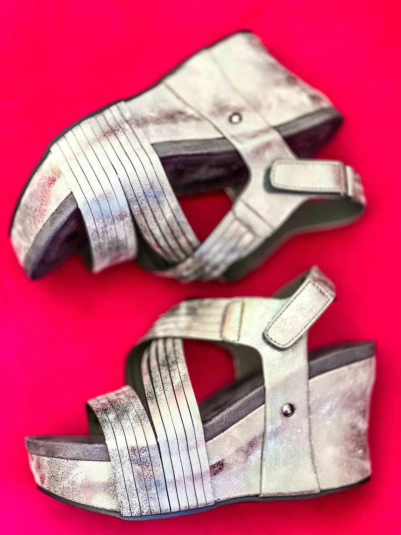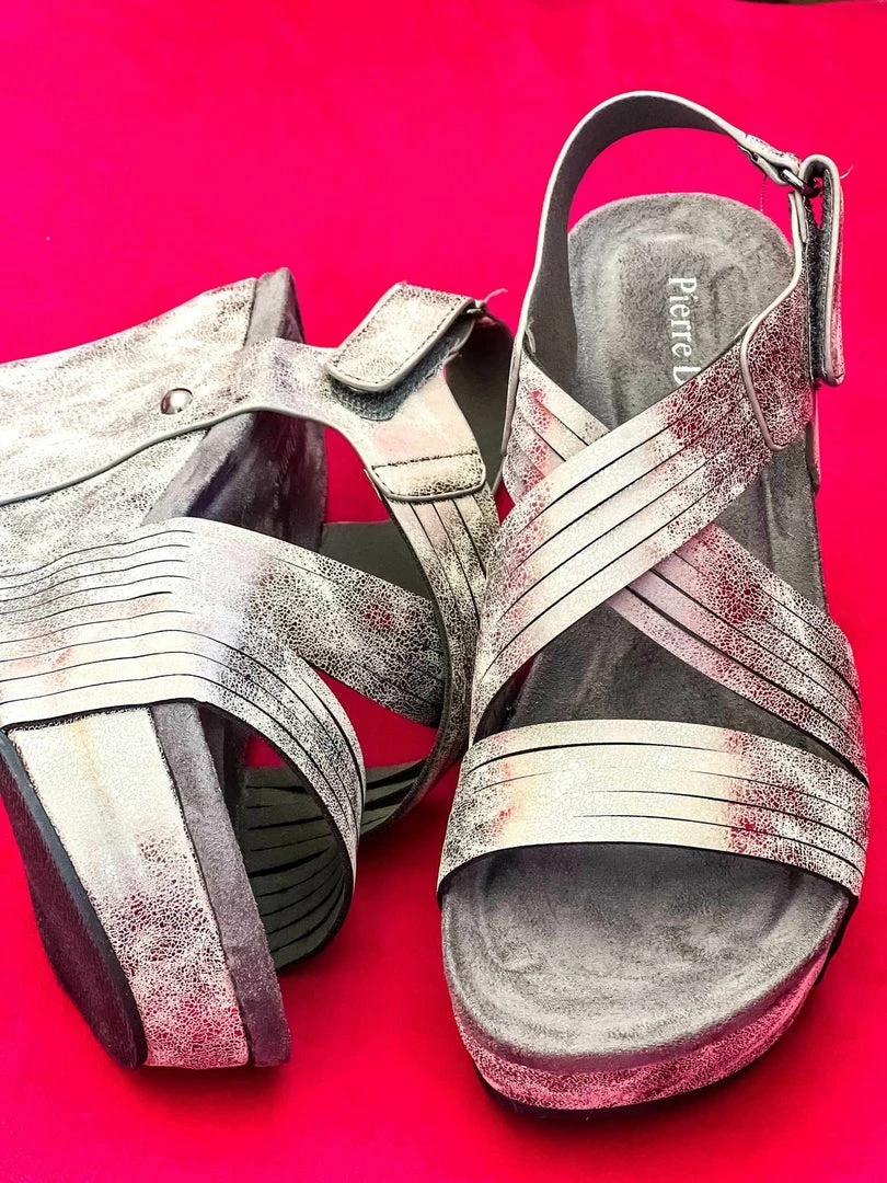 Chunky, edgy and oh so cool, these slingback wedge sandals are the perfect finishing touch to your summer looks! Featuring an open toe and criss cross straps in distressed silver, these put the “rock” in rockabilly!