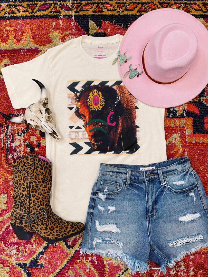 How darling is the Painted Buffalo Tee! You can never have too many graphic tees! Perfect for a casual look or dressing it up for the rodeo! Printed on a soft style unisex tee!