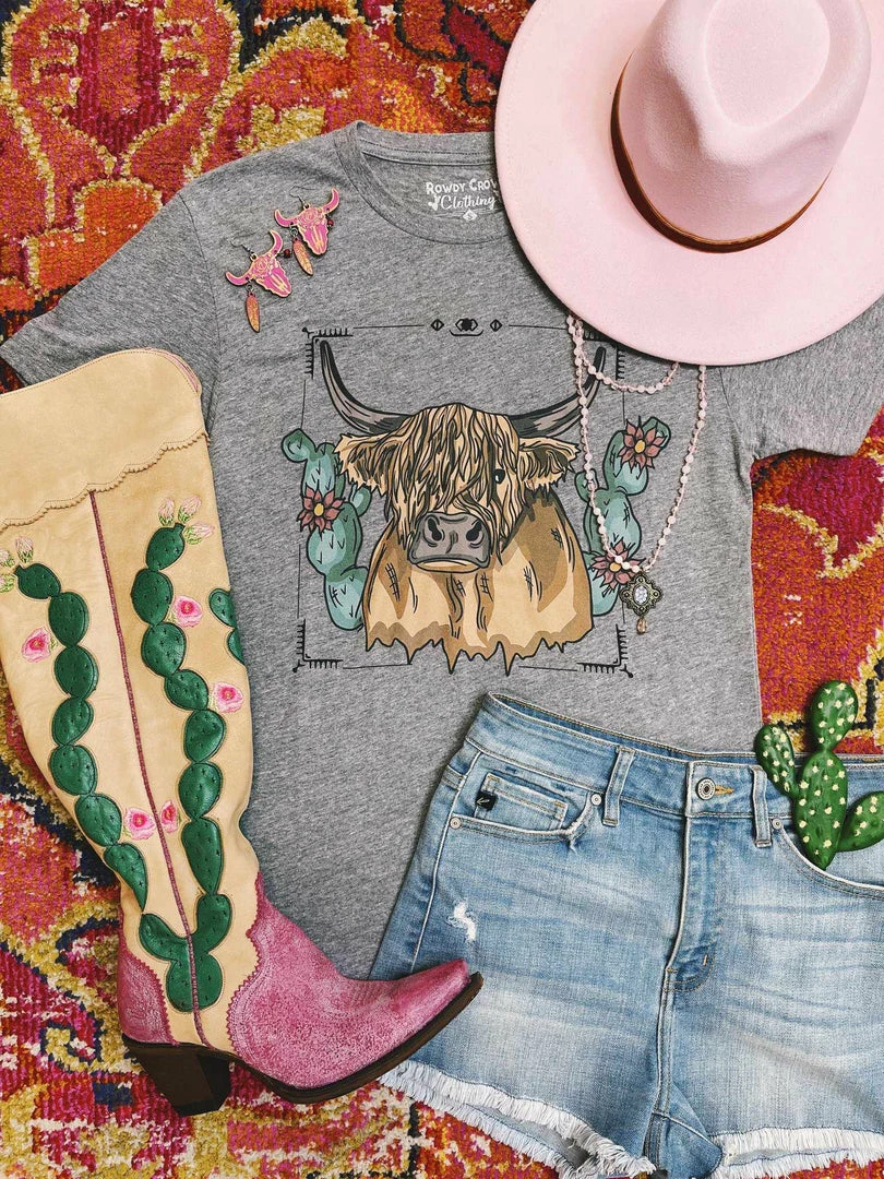How cute is this little swanky highlander! This lovely tee features the trendy highlander and can’t forget about the cactus! Wear this tee to the next rodeo! Pairs perfectly with denim and western boots!