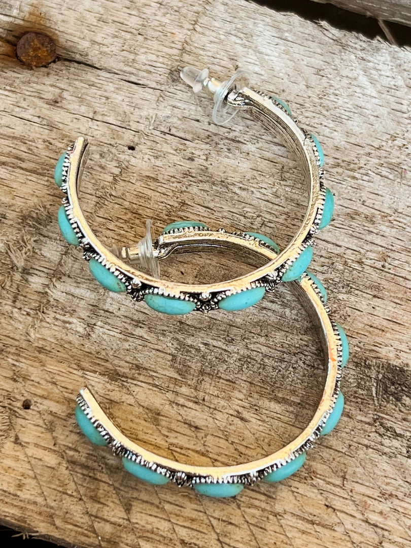 Classic hoop earrings in hammered silver with turquoise stones. A girl can never have too much turquoise, combined that with hoops and you’ve got your new favorite pair of earrings!