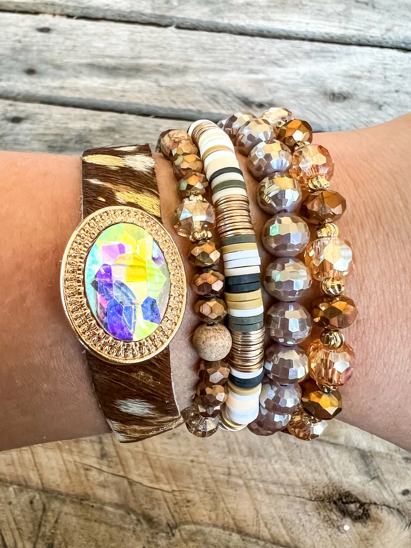 This brown, gold, and neutral stackable bracelet set features 4 multi beaded bracelets and 1 faux fur cuff with crystal emblem!