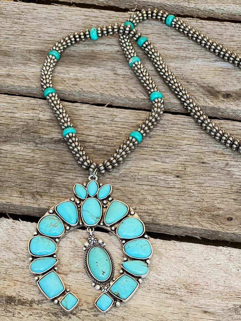 Our turquoise necklace with a huge squash blossom is big, bold, and beautiful! It’s a lovely, almost robin’s egg blue-green that’ll look amazing with your new blouse.
