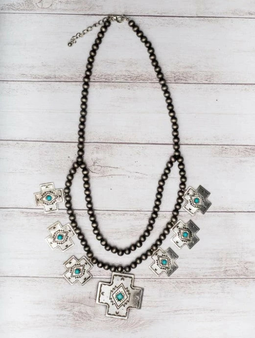 Gorgeous double layered Navajo pearl necklace! The aztec style crosses feature a small turquoise stone at the center of each for some serious cowgirl vibes!