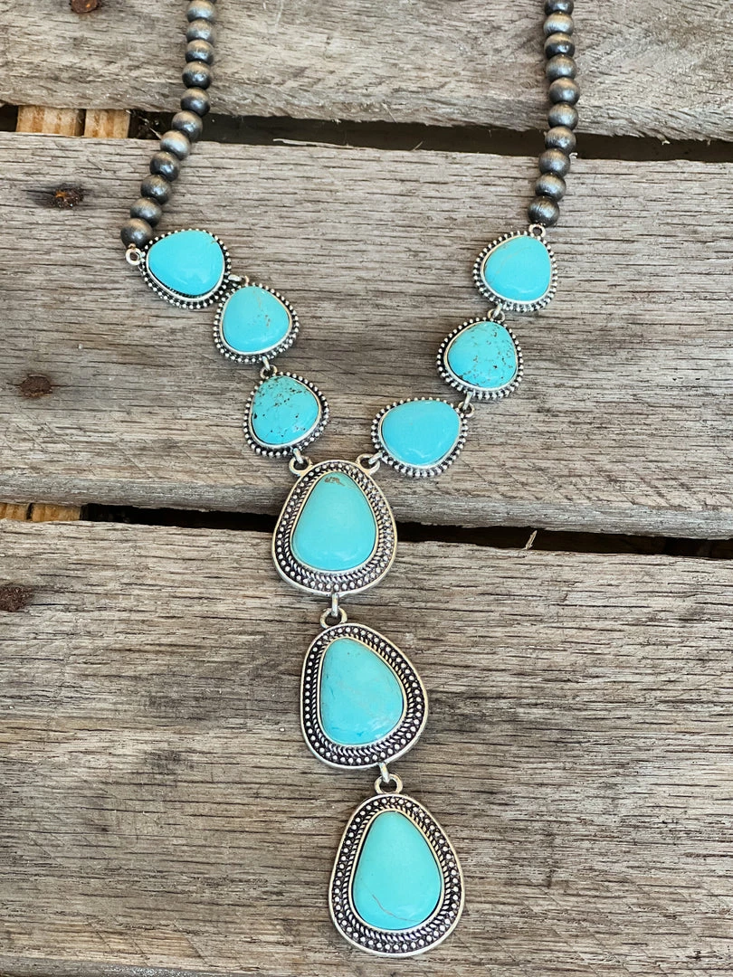 Gorgeous turquoise stones set in silver make this beaded necklace a showpiece! With a total of 9 turquoise stones, this statement necklace will be your go-to.