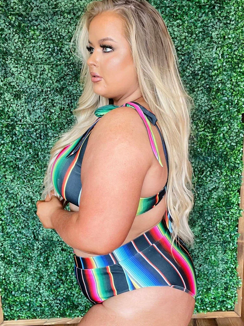 On trend high waisted bikini bottom keeps your tummy in and your figure on display! Sassy serape print with a thick band, these bikini bottoms can be mixed and matched with a variety of tops for a new look every time!