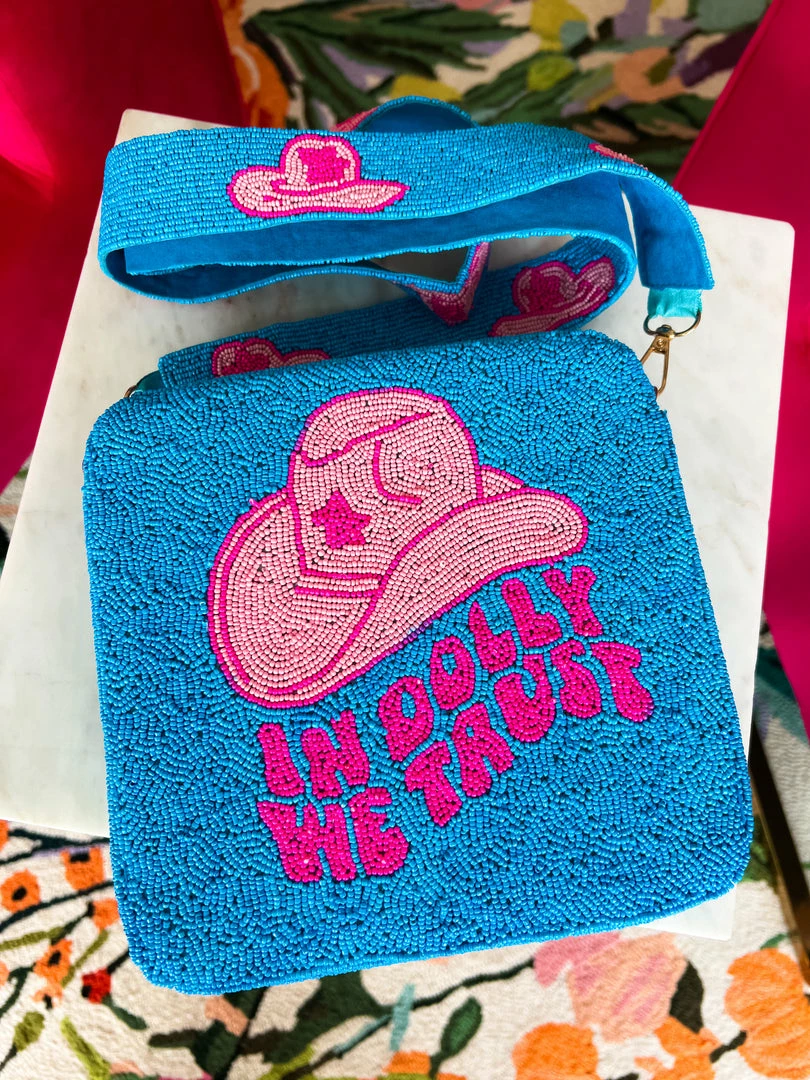 “In Dolly We Trust” blue seed bead handbag with a kickin’ pink cowgirl hat! This beautiful beaded handbag is hand made and one of a kind!