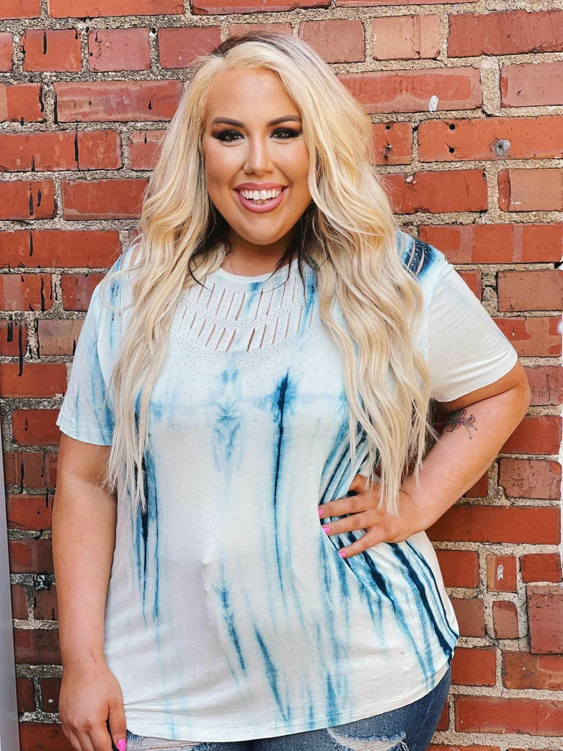 Vocal Tops Tie Die Laser Cut Short Sleeve Top With Bling – Blue & White